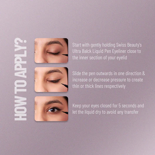 Looking for an eyeliner that truly enhances your eye makeup game? Look no further than Swiss Beauty's Ultra Black Liquid Pen Eyeliner. This waterproof eyeliner stays put all day long and delivers a hyper-glossy black finish that is sure to turn heads. With its super fine marker-like tip, this liquid eye pen glides on smoothly and precisely, without smudging, skipping or pulling. The felt application tip gives you the freedom to create versatile looks, from thin fine lines to dramatic cat-eye or winged bold lines.